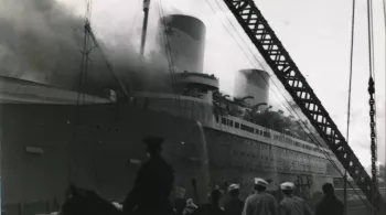 Le plus grand et le plus beau navire français, détruit par le feu en pleine guerre mondiale, sur les quais de Manhattan