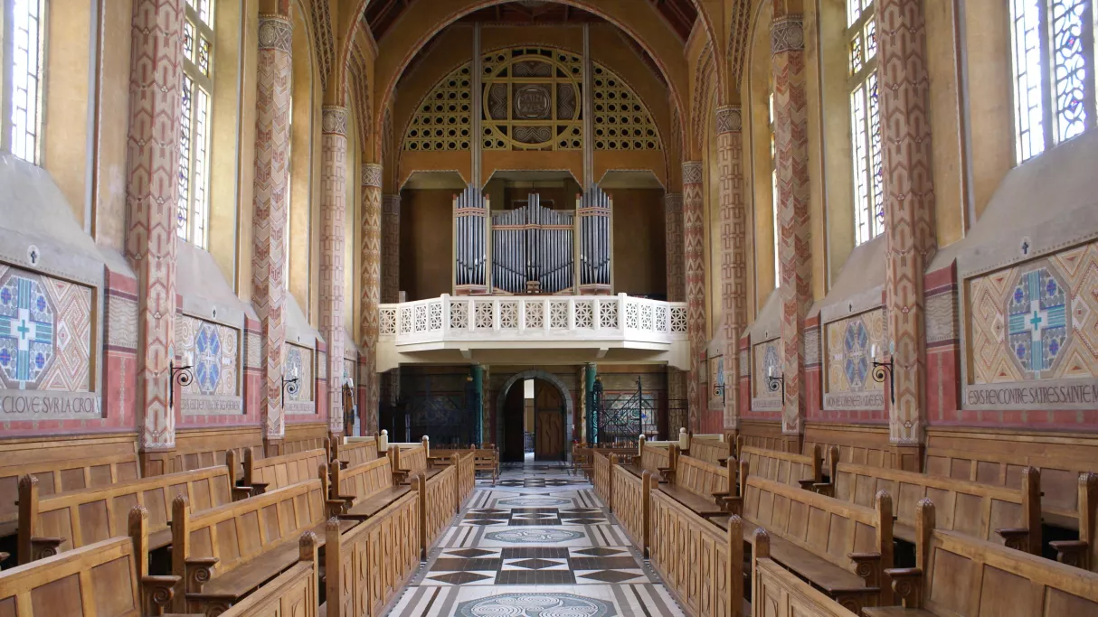 Entre 1927 et 1969, le Grand Séminaire de Saint-Brieuc imaginé par l’architecte Georges-Robert Lefort a formé des générations de prêtres. Aujourd’hui devenu la Maison diocésaine Saint-Yves, le site abrite une chapelle consacrée en 1929, véritable joyau de l’Art déco. Du sol au plafond, grille en fer forgé, peintures du chemin de croix, mosaïques des chapiteaux et autels signés Isidore Odorico présentent tous des motifs géométriques caractéristiques du mouvement Seiz Breur. Ce courant artistique breton de l’entre-deux guerres mêlait les motifs celtiques à l’Art déco pour créer un style unique et résolument moderne. Inscrite à l’inventaire des Monuments Historiques en 1995 et restaurée dans son esprit d’origine, la Chapelle de la Maison Saint-Yves est ouverte au public depuis 2017.