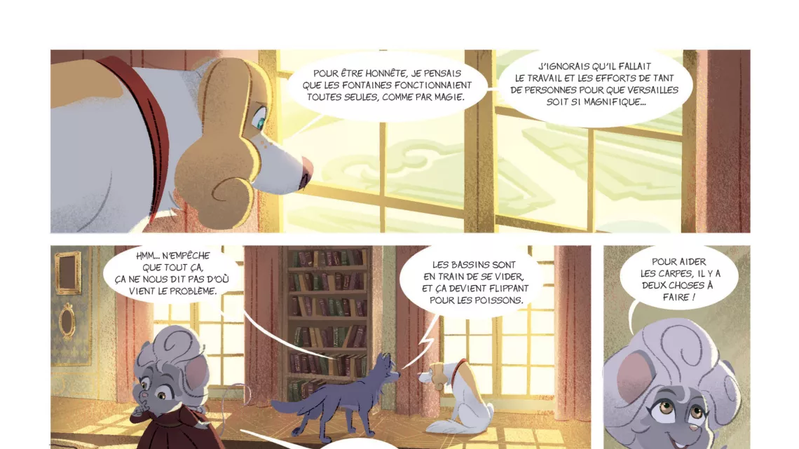 Encore une journée agitée à Versailles ! Le roi attend la visite de l’ambassadeur du chah de Perse et a bien l’intention d’émerveiller son invité avec le spectacle des fontaines des jardins du château. Mais près des bassins, c’est la panique. Il n’y a plus d’eau ! Belfort et son compagnon Lupin sont très inquiets pour leurs amis, les carpes Antras et Diem dont les œufs doivent bientôt éclore. Ils appellent donc Gazette, la petite souris, à la rescousse. Cette dernière va leur dévoiler les secrets de l’apprivoisement de l’eau à Versailles.