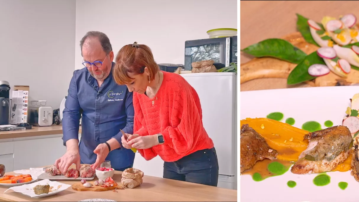 Aujourd’hui, notre chef Sylvain s’invite dans la cuisine d’Amélie, à Nantes. Amélie travaille dans l’événementiel et vit en appartement, ce qui l’amène à rechercher des plats qu’elle peut préparer le soir et réchauffer facilement le lendemain. Ne disposant pas de four, mais équipée d’un airfryer, elle pose un défi inhabituel à Sylvain. Après un passage au marché pour faire le plein de fruits, légumes et cailles, ils élaborent ensemble un menu créatif et savoureux, idéal pour s’adapter à son quotidien chargé. Au menu : cailles rôties au four, parfumées à la feuille de mandarine, chou-fleur en croûte de fromage de chèvre et noix, purée de patate douce avec un zeste de mandarine et feuilles d’endives crues au radis et morceaux de mandarine. Un épisode plein de vitamines pour apporter du soleil à vos repas d’hiver.