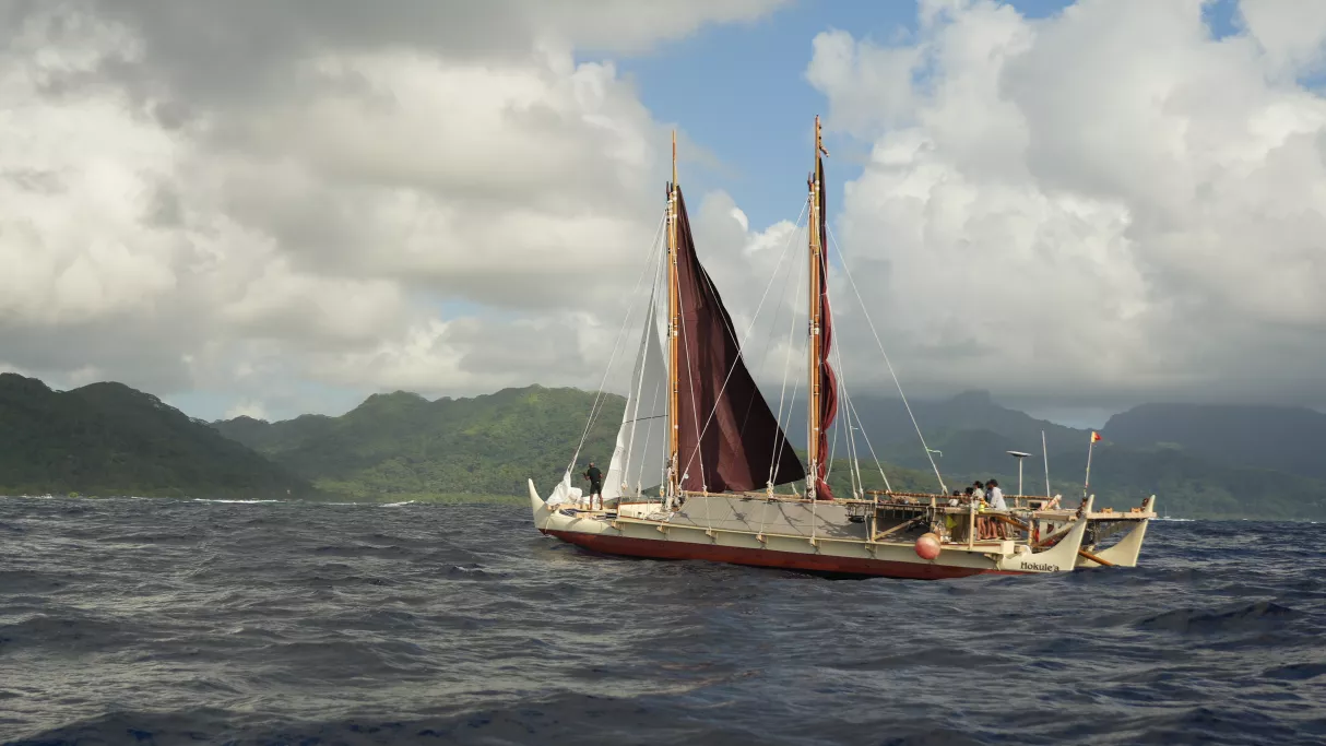 Hōkūleʻa navigue dans le cadre du Moananuiākea Voyage, un tour du Pacifique de quatre ans, dédié à la valorisation des savoirs de navigation ancestrale, à la sensibilisation aux enjeux climatiques et à la solidarité entre les peuples insulaires.