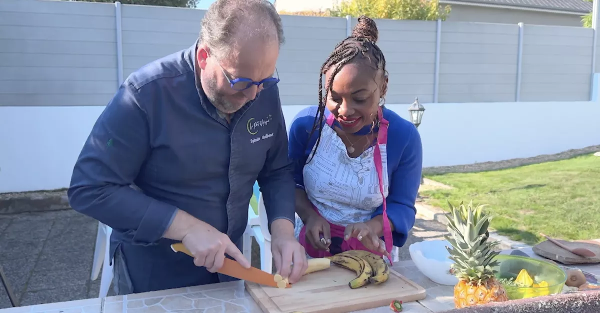 Dans son carré potager, Sylvain cueille quelques fleurs de courgette, tandis que Marie-France lui fait découvrir les saveurs de son pays d’origine : les bananes plantains et les épices camerounaises qu’elle a rapportées dans ses valises.