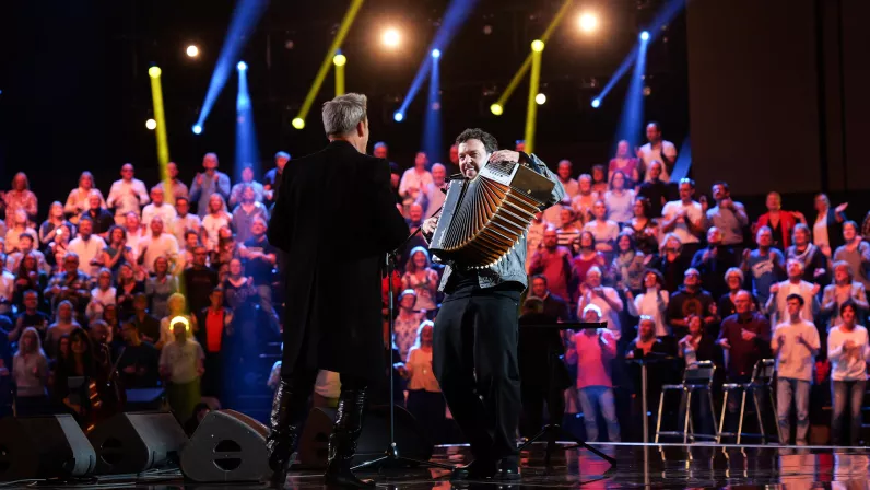 Chaque duo raconte une part de lui : la liberté revendiquée avec « Ma liberté de penser » aux côtés de Claudio Capéo, la fraternité avec « Alter Ego » chanté avec Jean-Louis Aubert, la complicité retrouvée sur « Châtelet les Halles » avec Zaz, l’émotion pure de « Et un jour une femme » avec Christophe Maé, ou encore la puissance lyrique de « Caruso » en compagnie de Roberto Alagna et la ferveur de « Oh Happy Day » avec Angélique Kidjo et la chorale gospel Sankofa Unit.