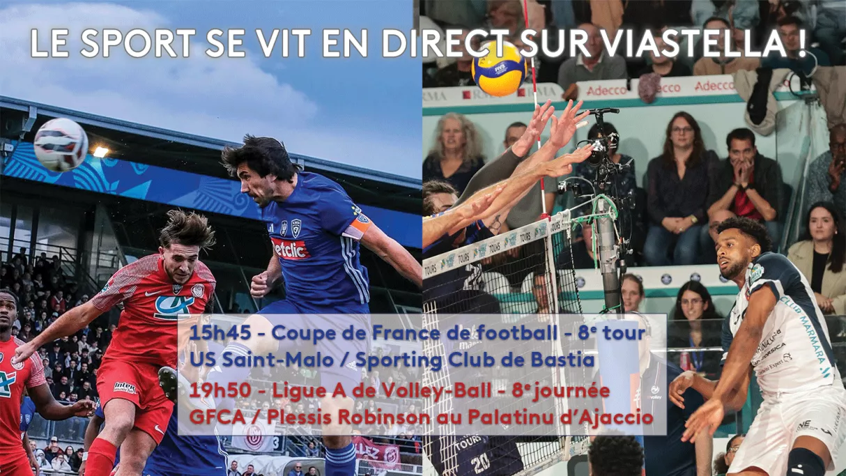ViaStella vous donne un double rendez-vous avec le sport insulaire ce samedi avec, dès 15h45, le match de coupe de France du SCB qui affronte Saint-Malo à Marville, suivi à 20h00 par une rencontre du GFCA volley-ball, club évoluant dans l'élite de la discipline, la ligue A, au Palatinu d'Ajaccio, contre l'équipe de Plessis-Robinson.