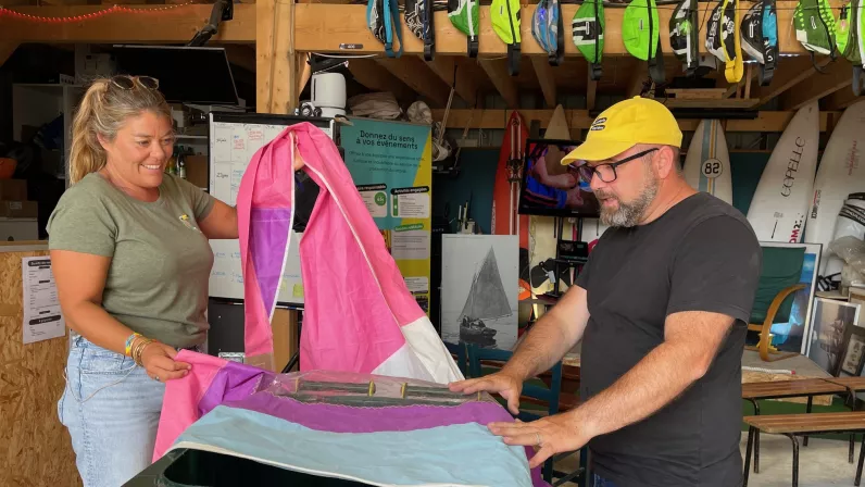 Julien Carlier, lui, est un fan de voile et de kitesurf sensible à l’environnement ! Il a eu l'idée de prolonger la vie du matériel nautique en créant une recyclerie maritime au Croisic. Grâce à des bacs de collecte installés dans les déchetteries ou dans des clubs de voile de la côte, il récupère du matériel qu’il revend dans la boutique de seconde main de la recyclerie ou qu’il transforme. Ici, de vieilles voiles ou des cartes marines retrouvent une nouvelle vie en se métamorphosant en sacs de plage ou abat-jours stylés.