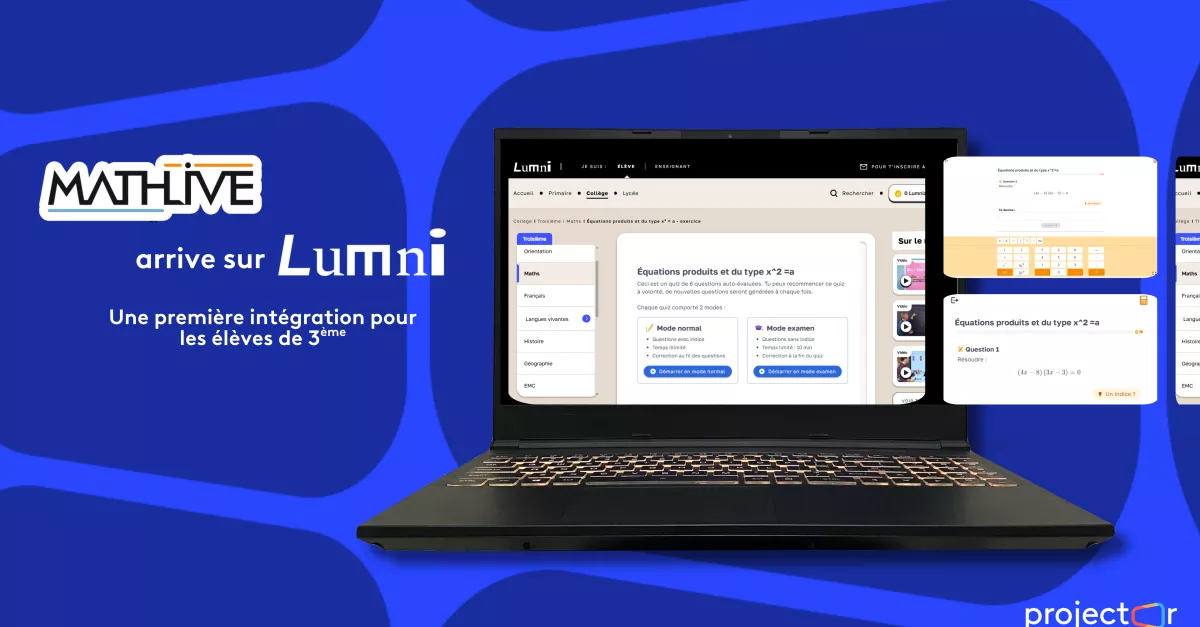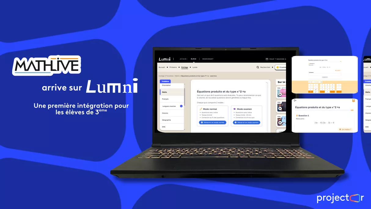 La plateforme Lumni s’enrichit d’un nouveau levier d’apprentissage en intégrant MathLive, un exerciseur de mathématiques innovant, porté par l'incubateur Projector de France Télévisions. Désormais, les élèves de 3ème bénéficient d’un accès gratuit et illimité encore jamais vu pour s’entraîner, progresser et consolider leurs acquis.